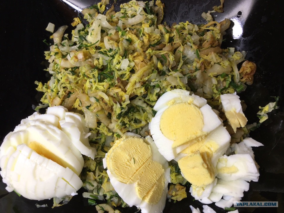 Соединим нашу начинку : в обжаренную капусту добавим рубленные яйца, зелень.