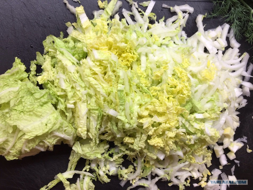 Китайская капуста незаслуженно обходится стороной, возмущаюсь этим фактом постоянно:) А ведь она во многих смыслах удобнее и лучше обычной! Нежнее, пластичнее.. Шинкуем тонко: