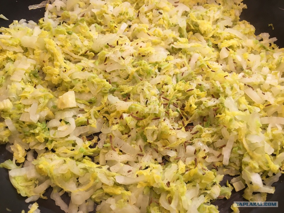 Обжариваем на сухой сковороде, это очень просто. Швырнула туда тмину зачем-то (нравится он в капусте, это личное)