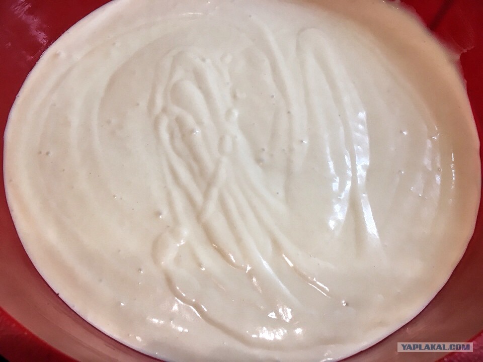 Постепенно вводим муку+разрыхлитель, перемешиваем до достижения консистенции густой сметаны.