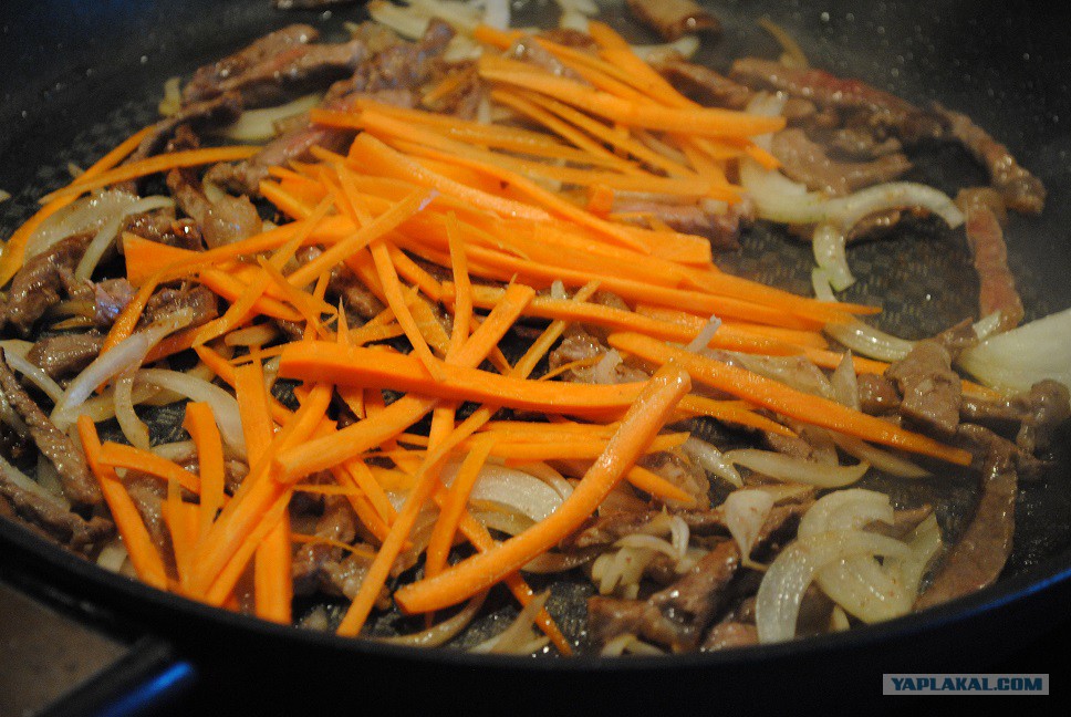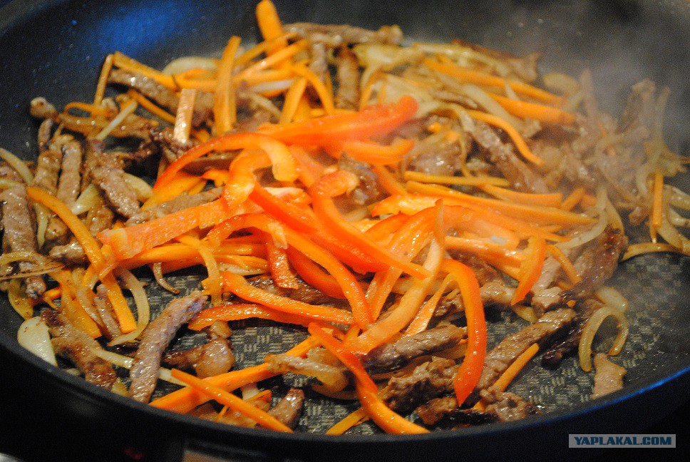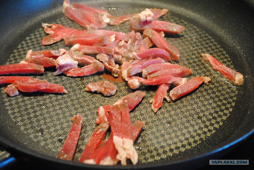 Я ещё не говорил, что сковородка уже разогрелась? Ну разогрелась она . И мясо в неё