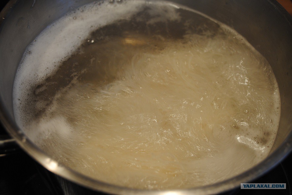Первым делом лапшу в воду кипящую, на минуту. Нефиг ей больше там делать.