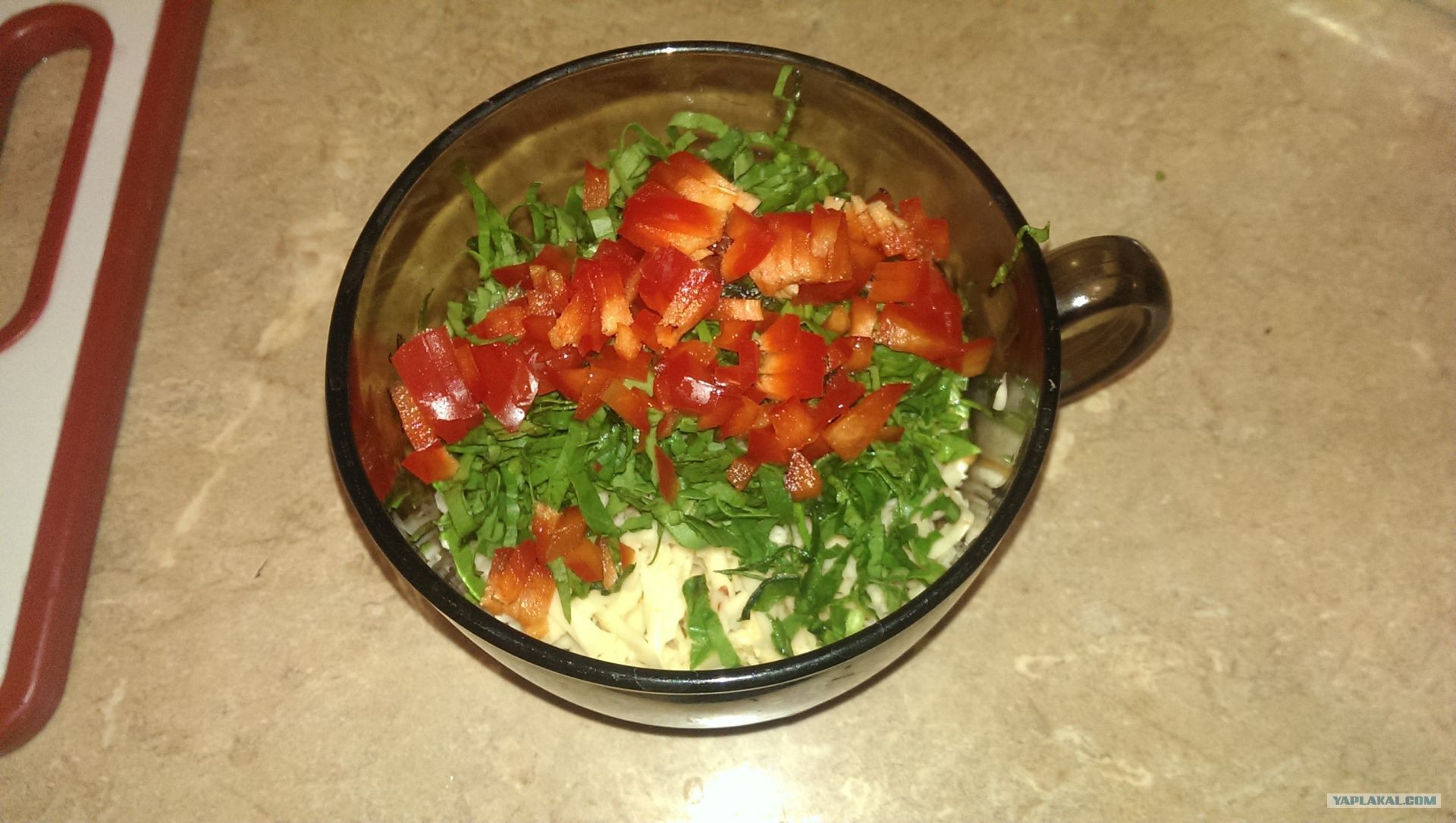 6. Меленько шинкуем шпинат и перец, все смешиваем