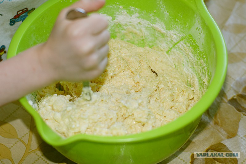 Дальше просто вилкой смешивается творог, яйца и сахар. Если потом в печенье будут попадаться комочки творога – они лишь придадут ему приятную кислинку с творожным привкусом. Нам так больше нравится.
