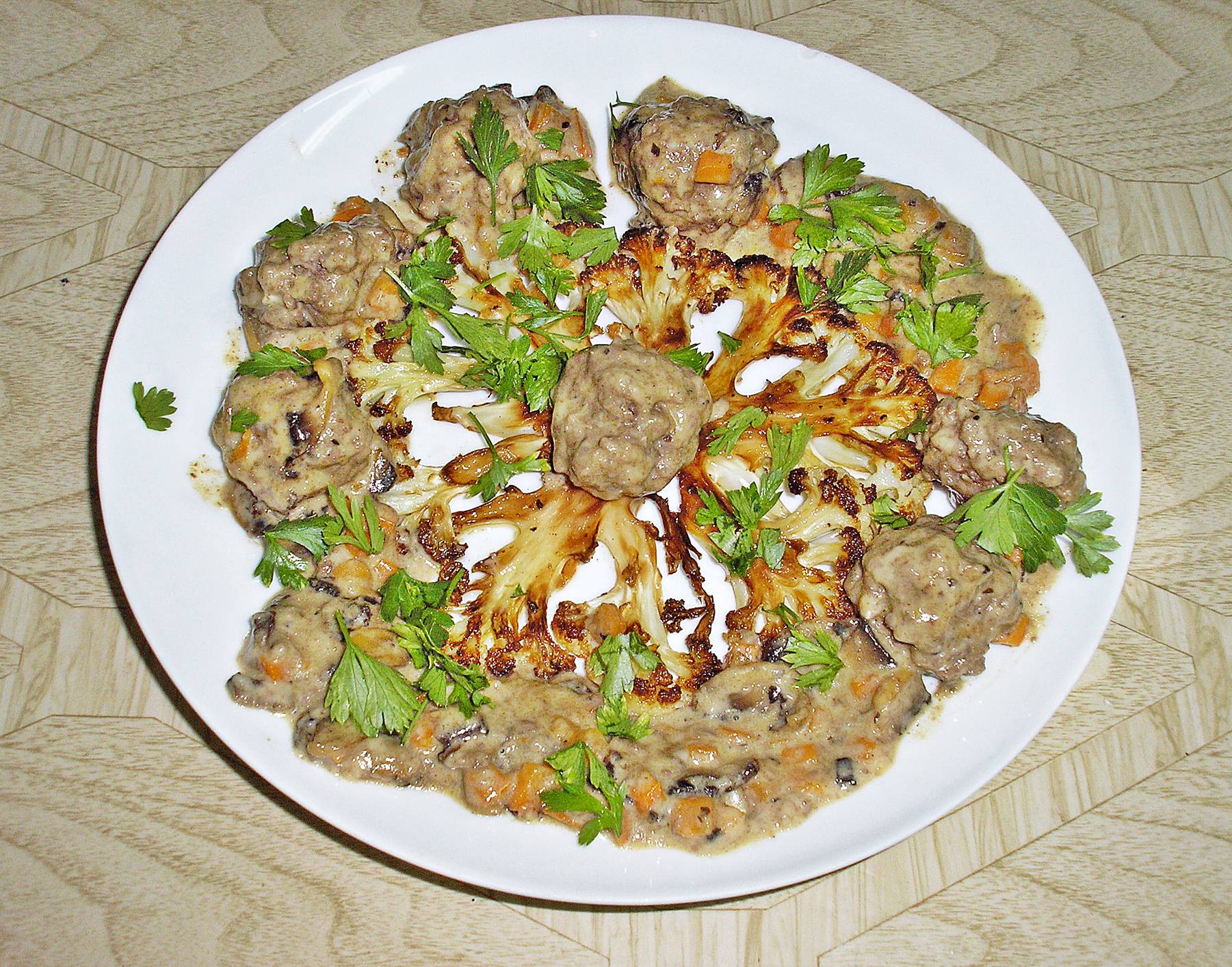 А чё капуста и почему капуста?? Да вон, я её смотрю как раз в интернетах. Вон там чё твориттся – они СТЕЙКИ из цветной капусты делают! Реально, так и называется – стейки! Только у них это всё же неправильно: если из капусты стейк – то на гарнир должно быть мясо, а то у них уныло как-то выходит. Красиво, но уныло – то стейк из капусты на пюре из капусты faceoff.gif , то тот же стейк в грибном соусе, но опять одна капуста.