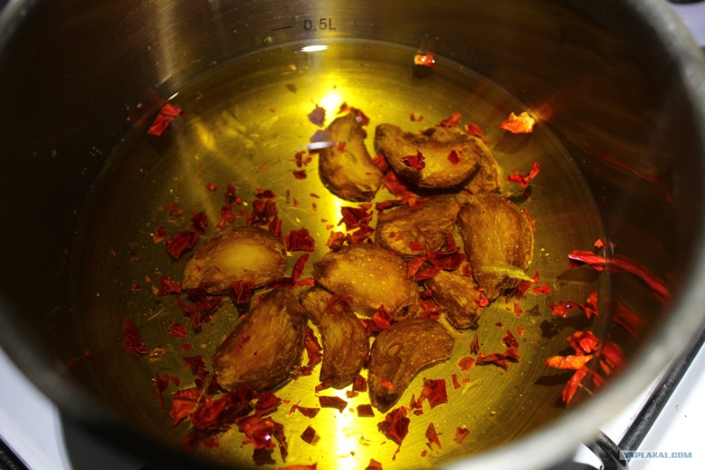 Для этого возьмем одну головку чеснока, 2 стакана оливкового масла и 1 столовую ложку хлопьев красного перца.