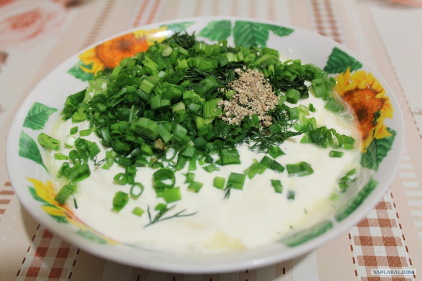 Мелко режем лук и укроп...добавляем в наш соус...и готово! Не Забываем про перец!