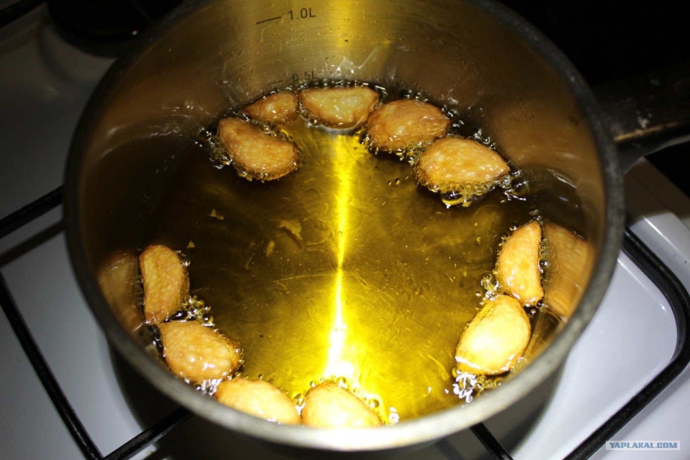 Чеснок делим на зубчики, в небольшую кастрюлю наливаем оливковое масло (2 стакана) и доводим масло до кипения.