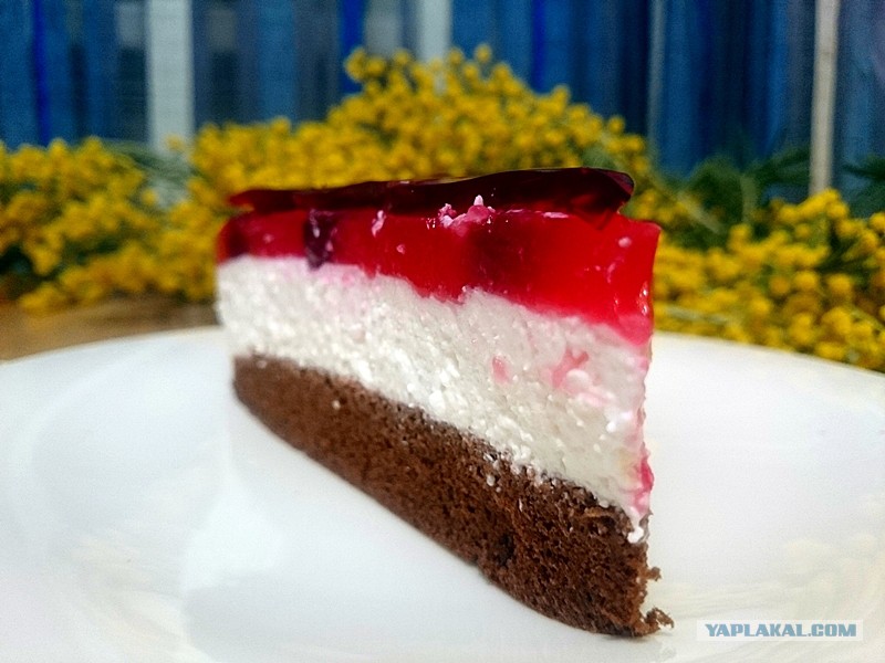 Сверху на торт выкладываем порезанное пластинами вишневое желе, оно более насыщенное как по вкусу, так и по цвету.