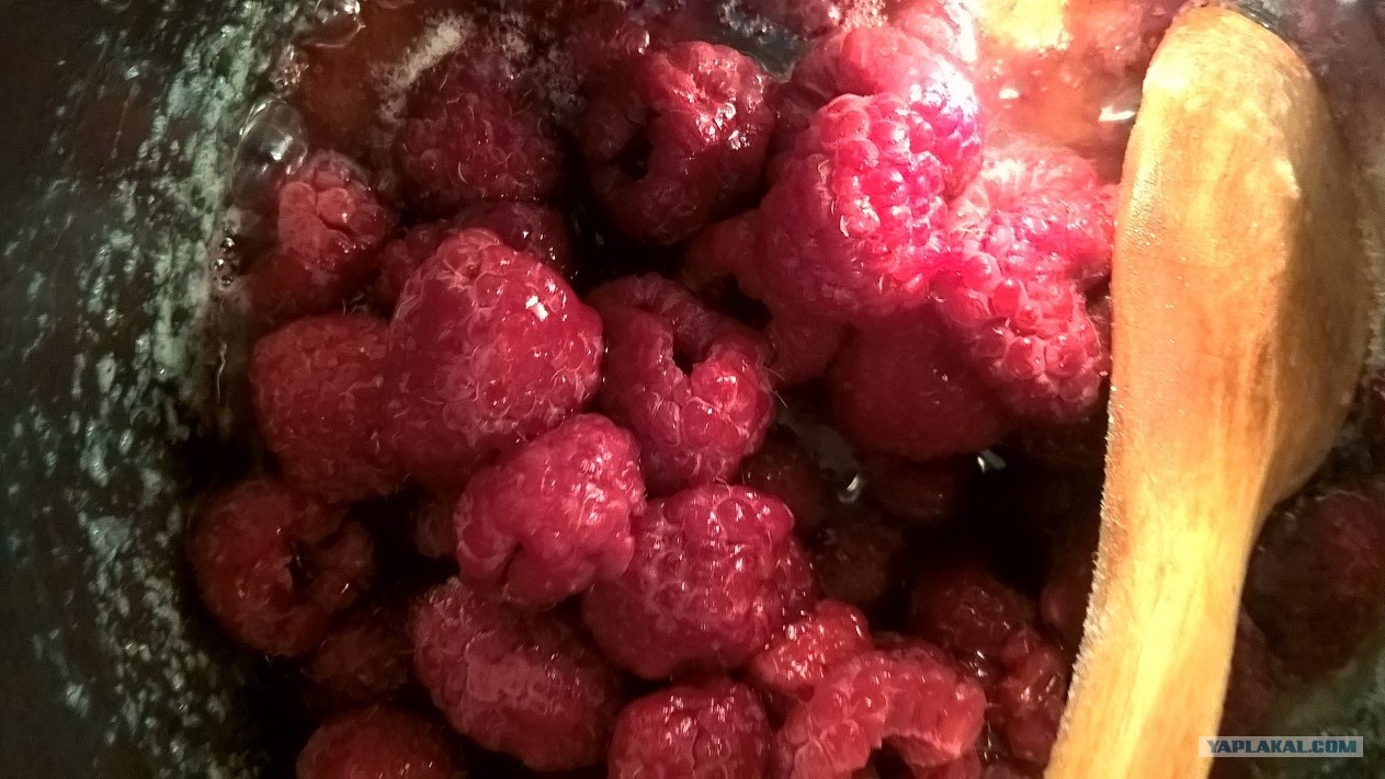 Добавить размороженную малину, потомить 5-7 минут на среднем огне. Соус можно процедить, мне нравится с кусочками и косточками)