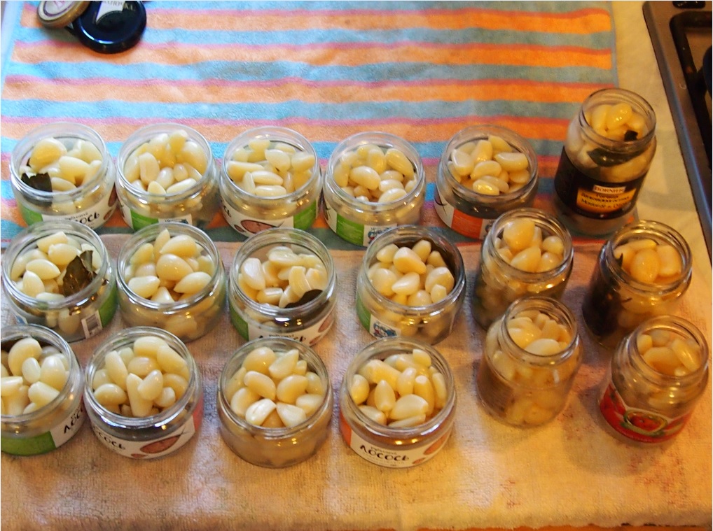 Раскладываем листья лавра, а на него ошпареный чеснок по баночкам.