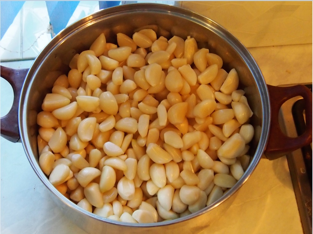 Заливаем чеснок 2,5 литрами кипятка и даём постоять 8-9 минут