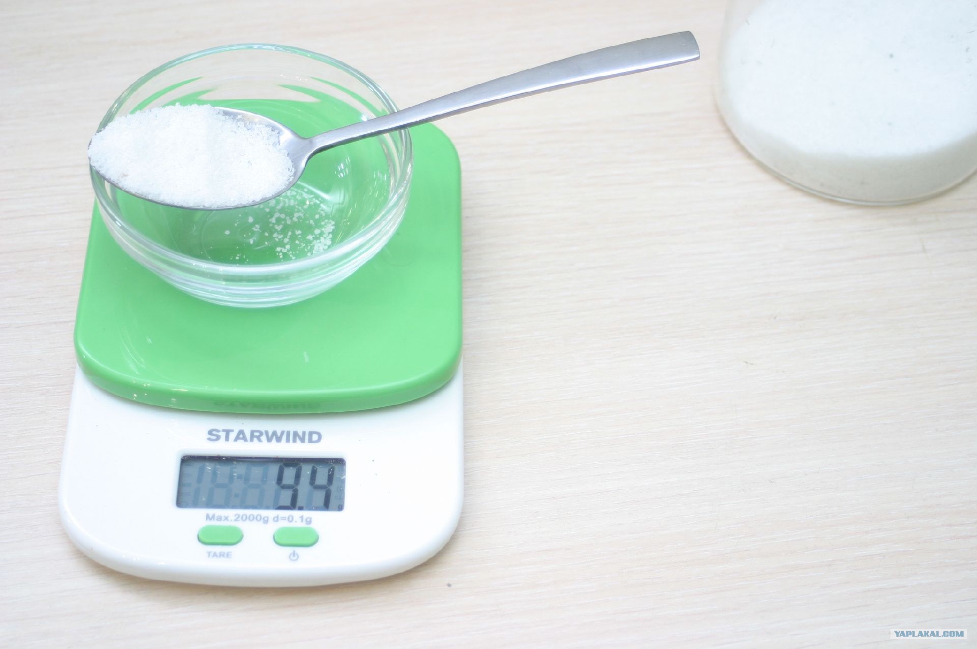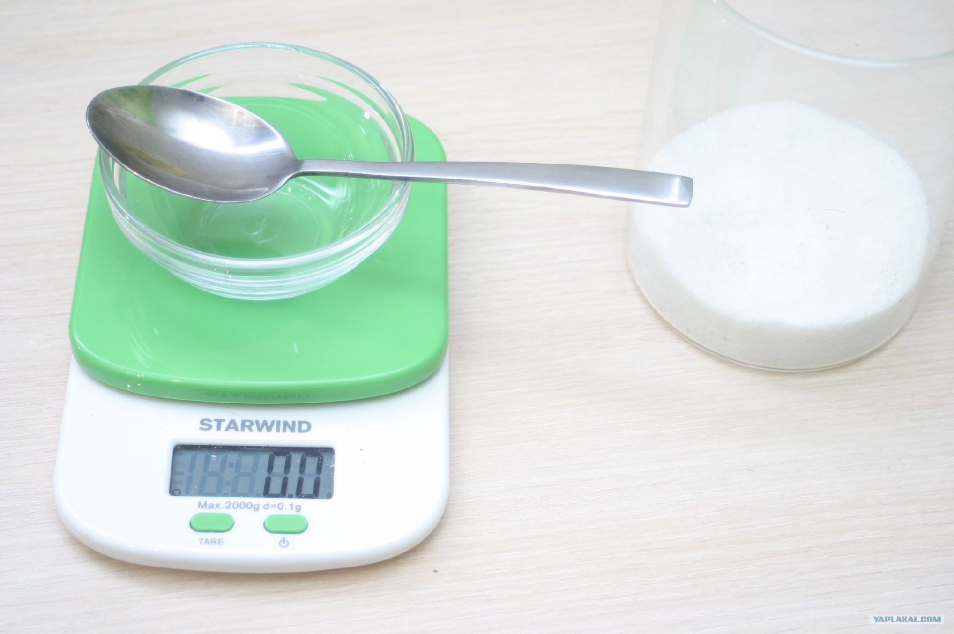 Весы электронные, оттарены вместе с емкостью и ложкой, для простоты взвешивания и для наглядности.