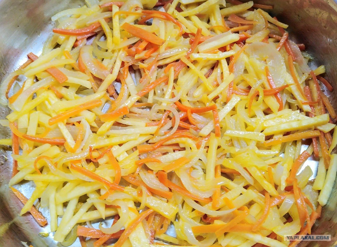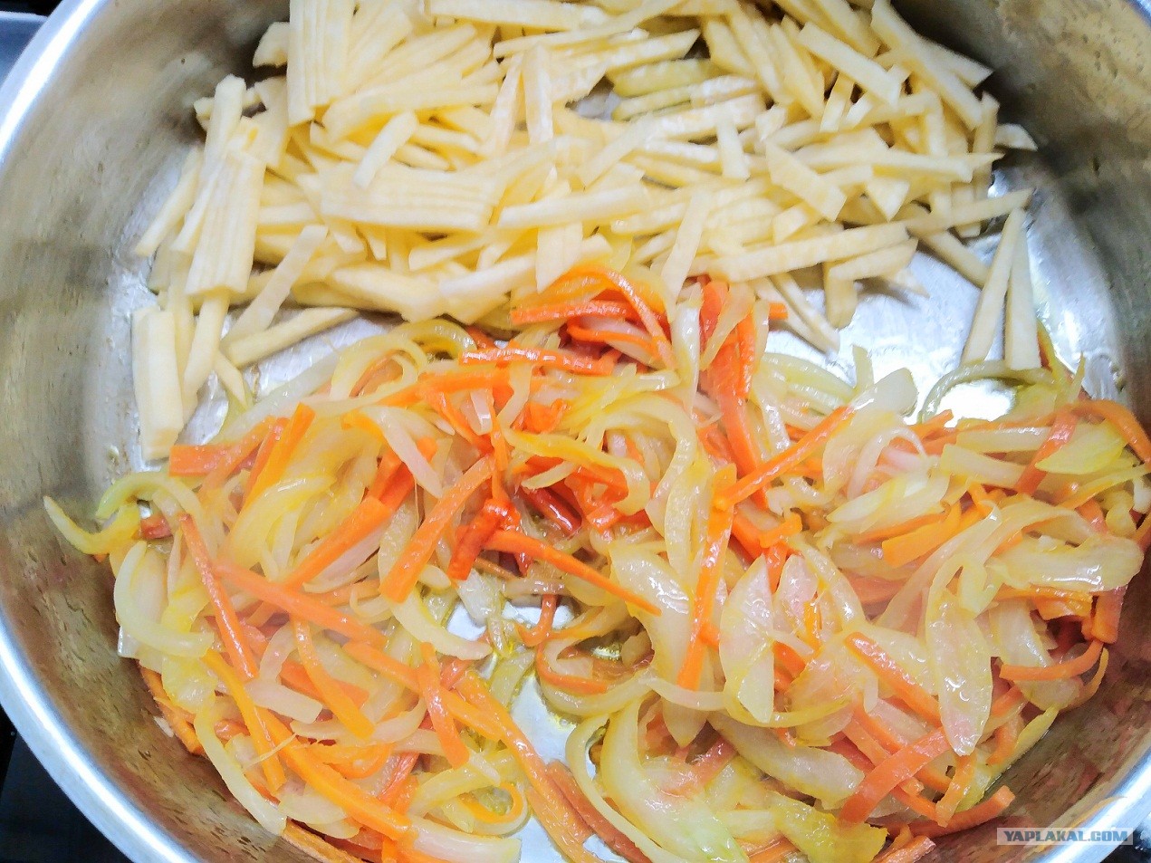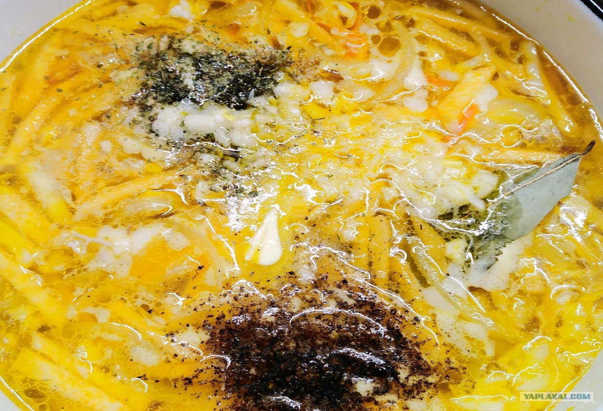 Капуста, пассеровка, перловка, кура, бульон. Вместе закипели.