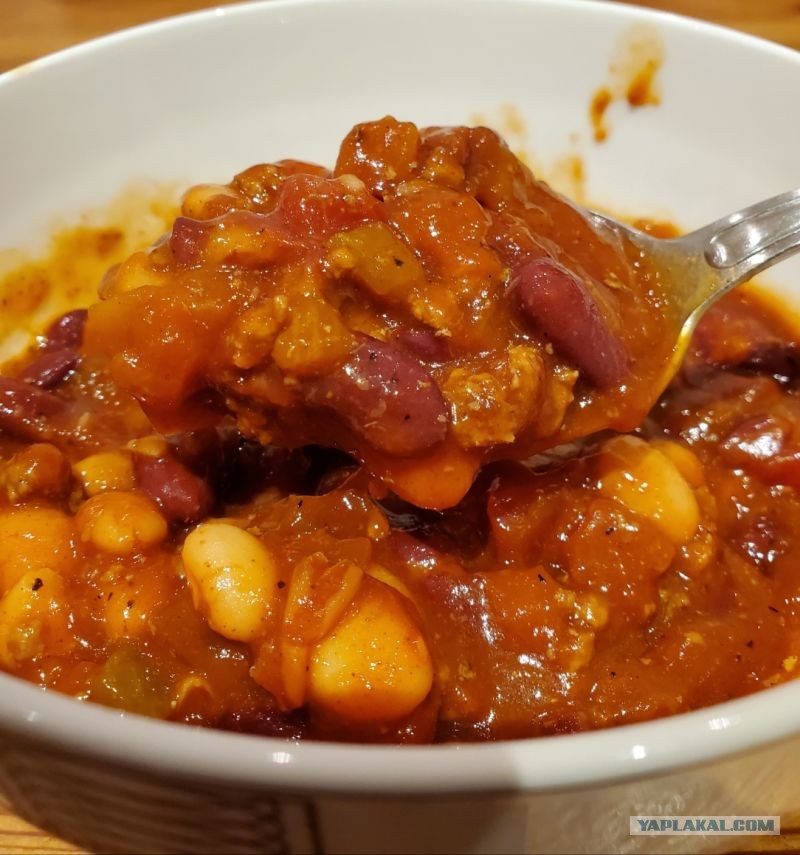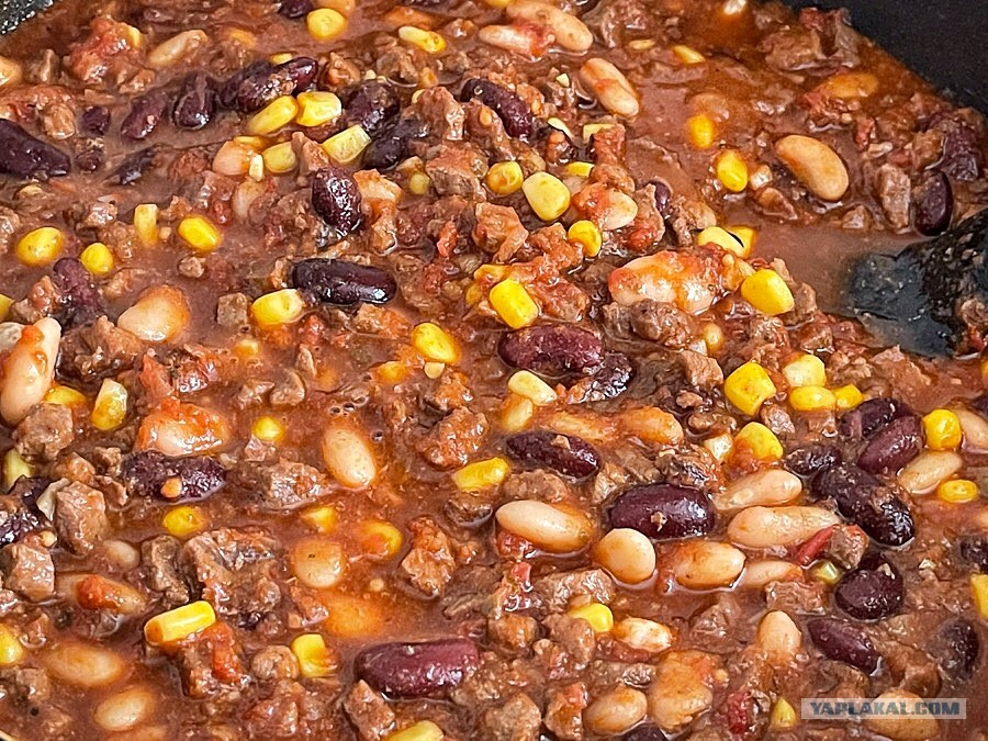 История возникновения этого блюда корнями уходит в ледниковый период: однажды на границе Штатов и Мексики случилось похолодание... Перец чили, шоколад "Алёнка", мясо мамонта - грелись, как могли! cool.gif