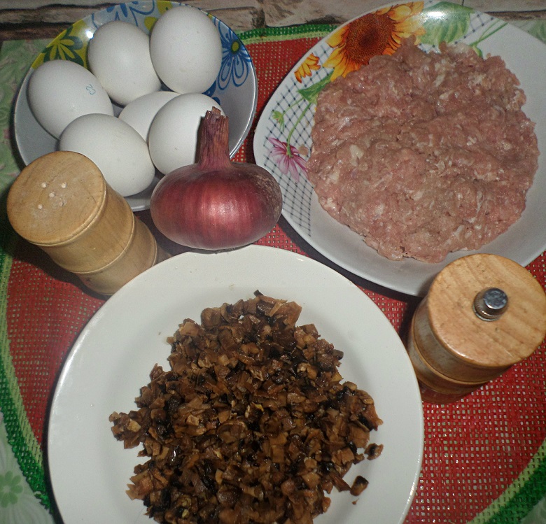 ЯЙЦА 6 штук. Грибы (в моем случае шампиньоны) луковица, Фарш грамм 300 соль, перец