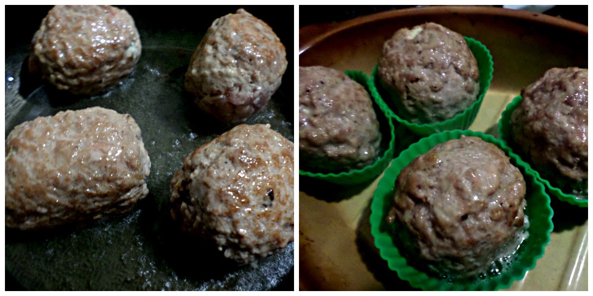 Укутать в мясной фарш и обжарить в раскаленном масле по полминутки с каждой стороны и после в духовку минут на 20-30