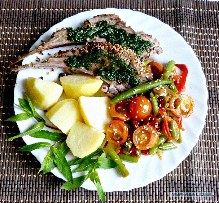 Каре ягненка в панировке из пряностей под мятным соусом с овощами.