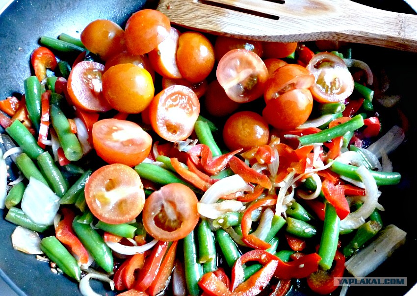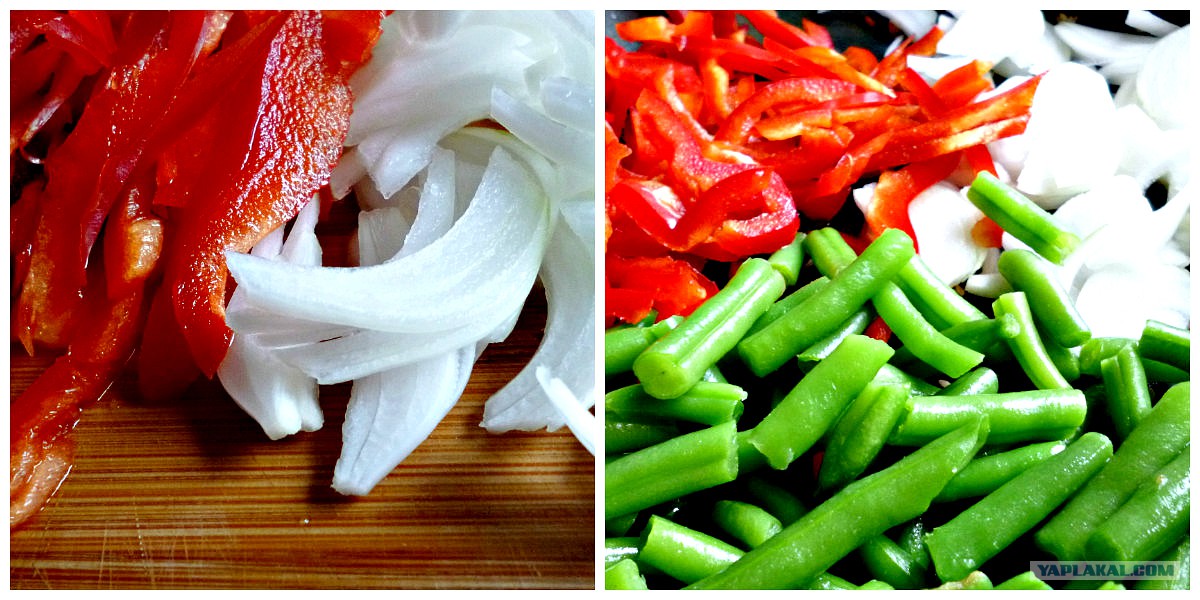 И вместе с фасолью - на сковороду, в то самое масло, в котором обжаривалось мясо.