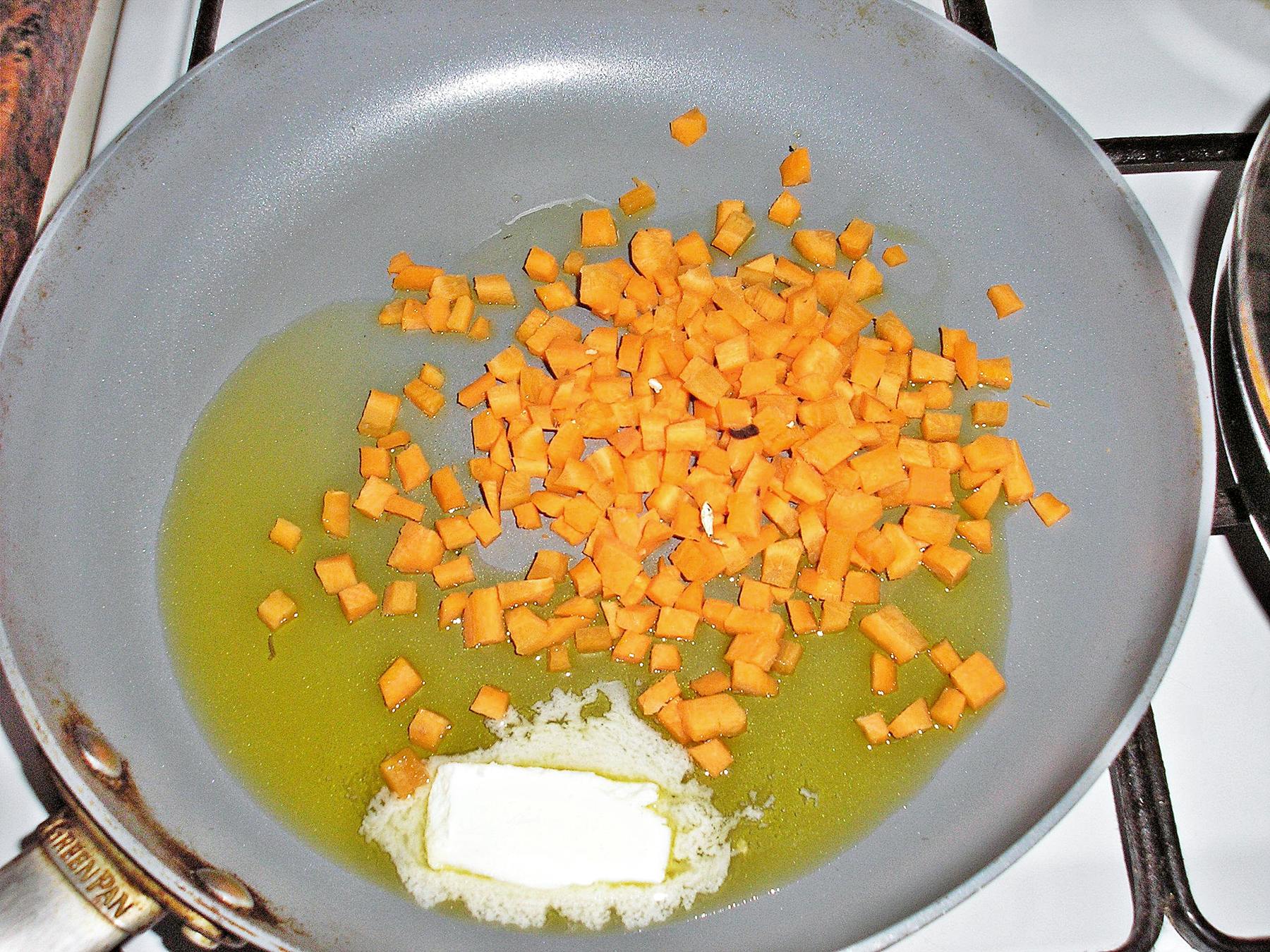 Капуста там пока потеет под крышкой, а я возьму ещё одну сковороду (да хоть всю посуду ради такого гостя перепачкаю, не жалко) и напущу на неё ту же комбинацию масла. И морковь туда!