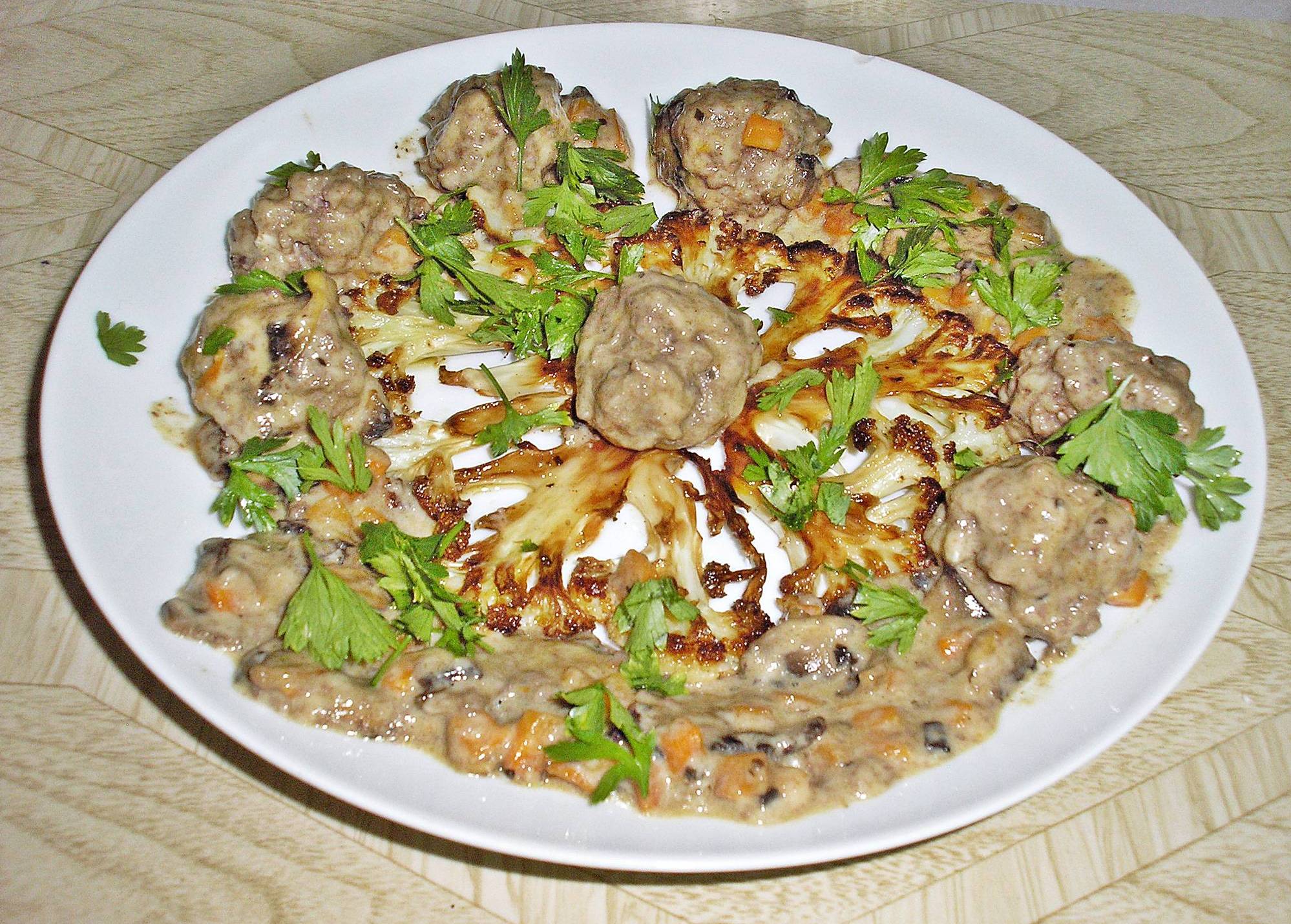 Капуста! С гарниром из тефтелей в винно-сливочно-грибном соусе! Ещё и петрушки сверху накидаем, мля!!!
