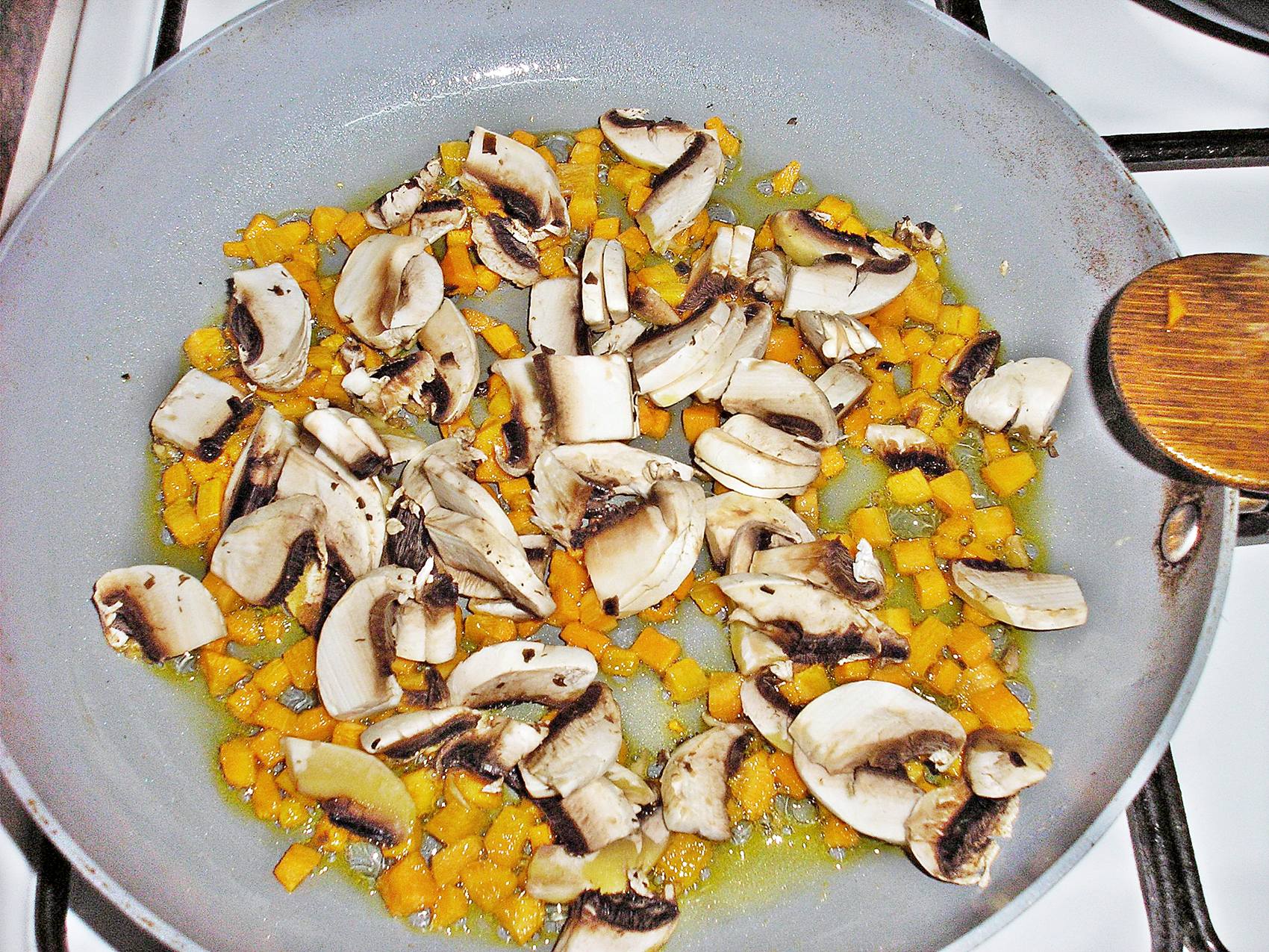И жарим её на небольшом таком огне, а то сгорит и не прожарится. А это вам не мясо – тут основательно жарить надо! Можно кстати и под крышкой.