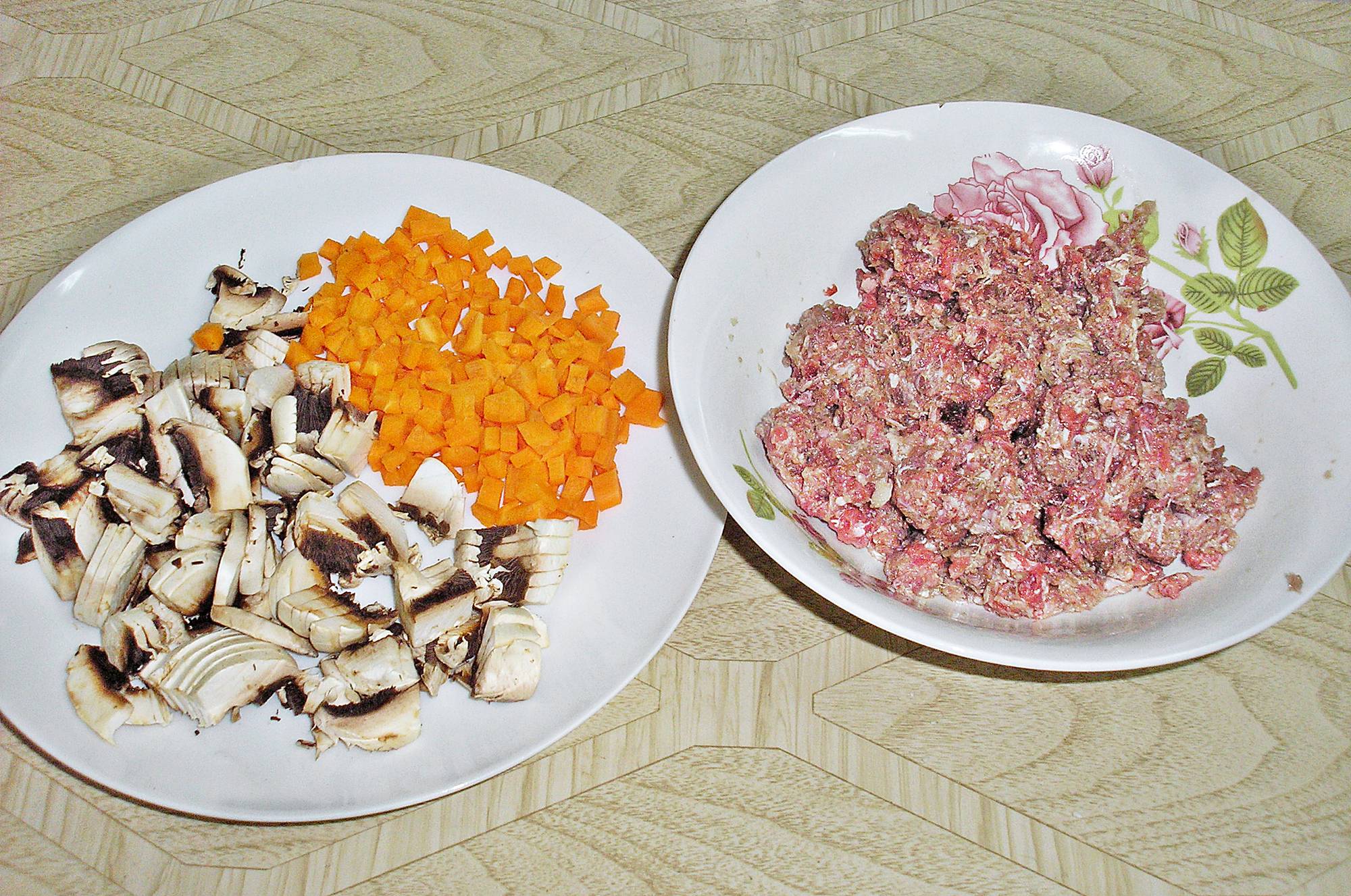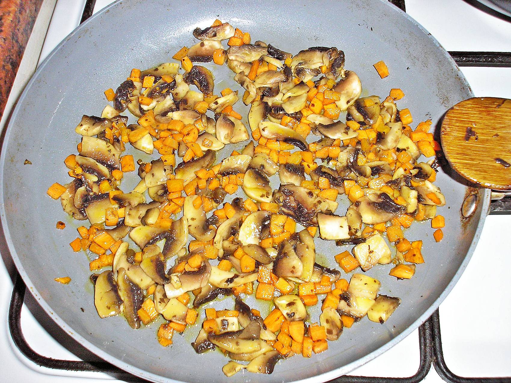 А пока она жарится, я успею и морковку с грибами нарезать, а лук на тёрке натереть лень его тереть, в овощерезку его и вхлам перемолоть. И в фарш, и перемешать понятно: