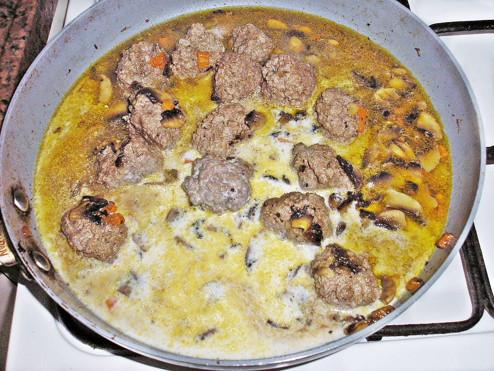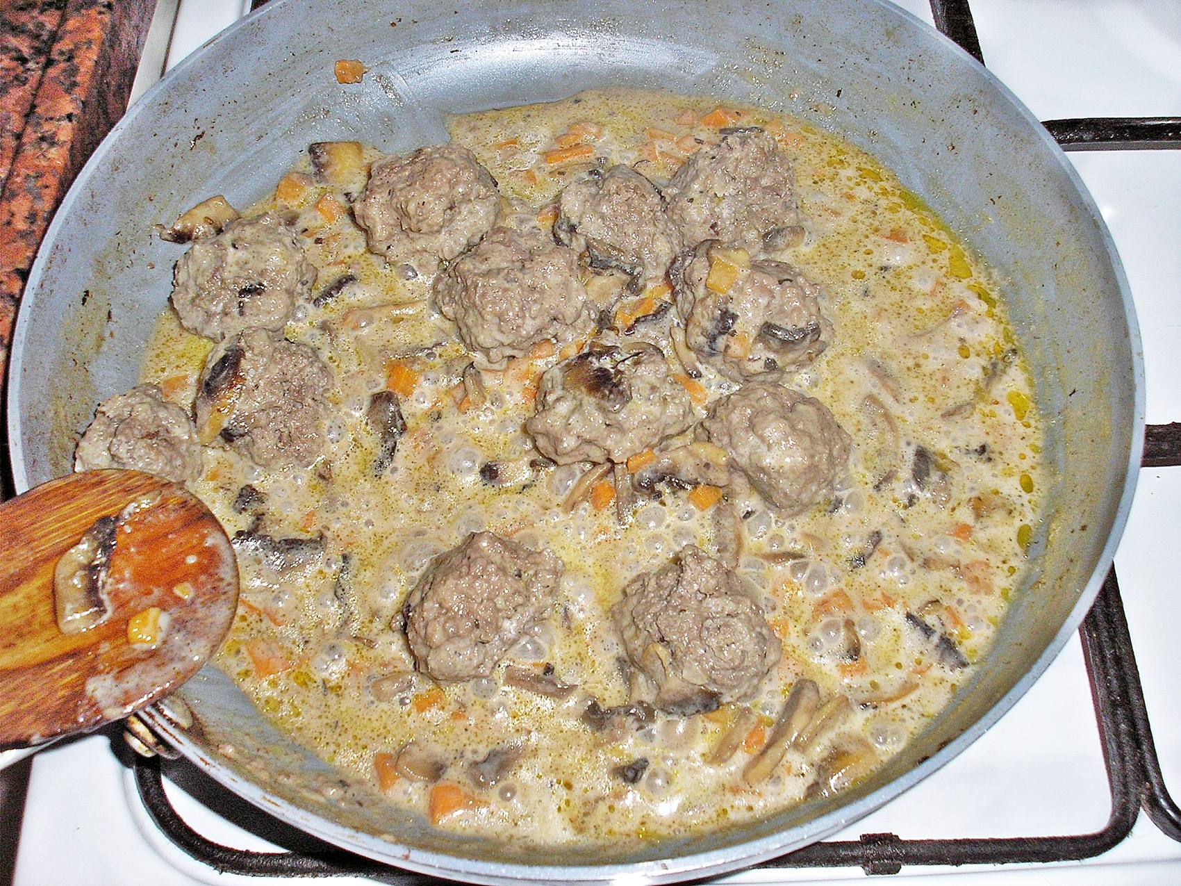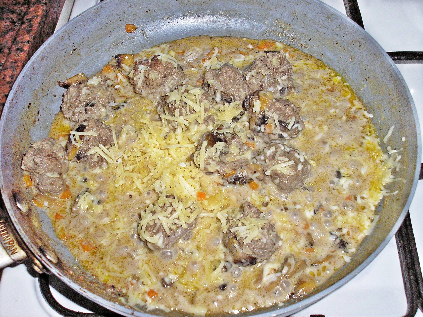 Перемешиваем это всё на минимальном огне, сыр плавиться и расползаеться (в этом месте грамарнаци злобно плюются в экран), и мы можем покатать тефтели по сковороде и извозюкать их в соусе.