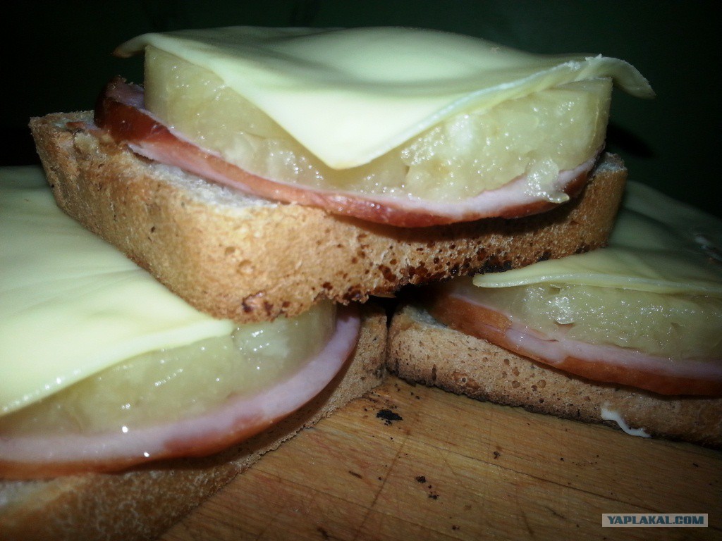 Вот так выглядят они стопкой. Хлеб стал хрустящий, ветчина прогрелась и сыр там в норме. А вот по ананасам, ну прямо на любителя, да, да, именно так. Дети то, у меня из этого и не захотели есть. Короче, горячий и влажный ананас на любителя. Вот как то так, такая правда матка )))).