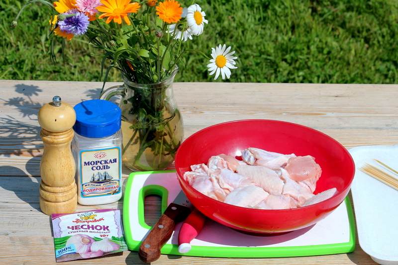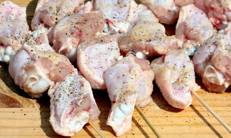Нанизала крыльи части на шпажки, по три штуки на каждую. Опасалась, что с этим пунктом будут проблемы, но это оказалось вполне даже легко. Затем посолила-поперчила и посыпала чесночным порошком с двух сторон. И рукой прихлопнула:
