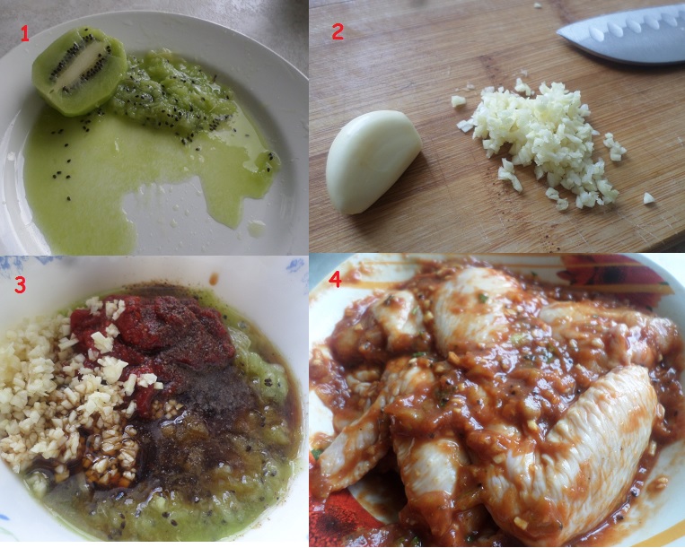 1. Киви натерла на терке. 2. чеснок измельчила. 3. добавила пасту, соевый соус, перец и чуть соли, но лучше попробовать, перед добавлением. 4. залила маринадом крылья и оставила на ... часа 2.