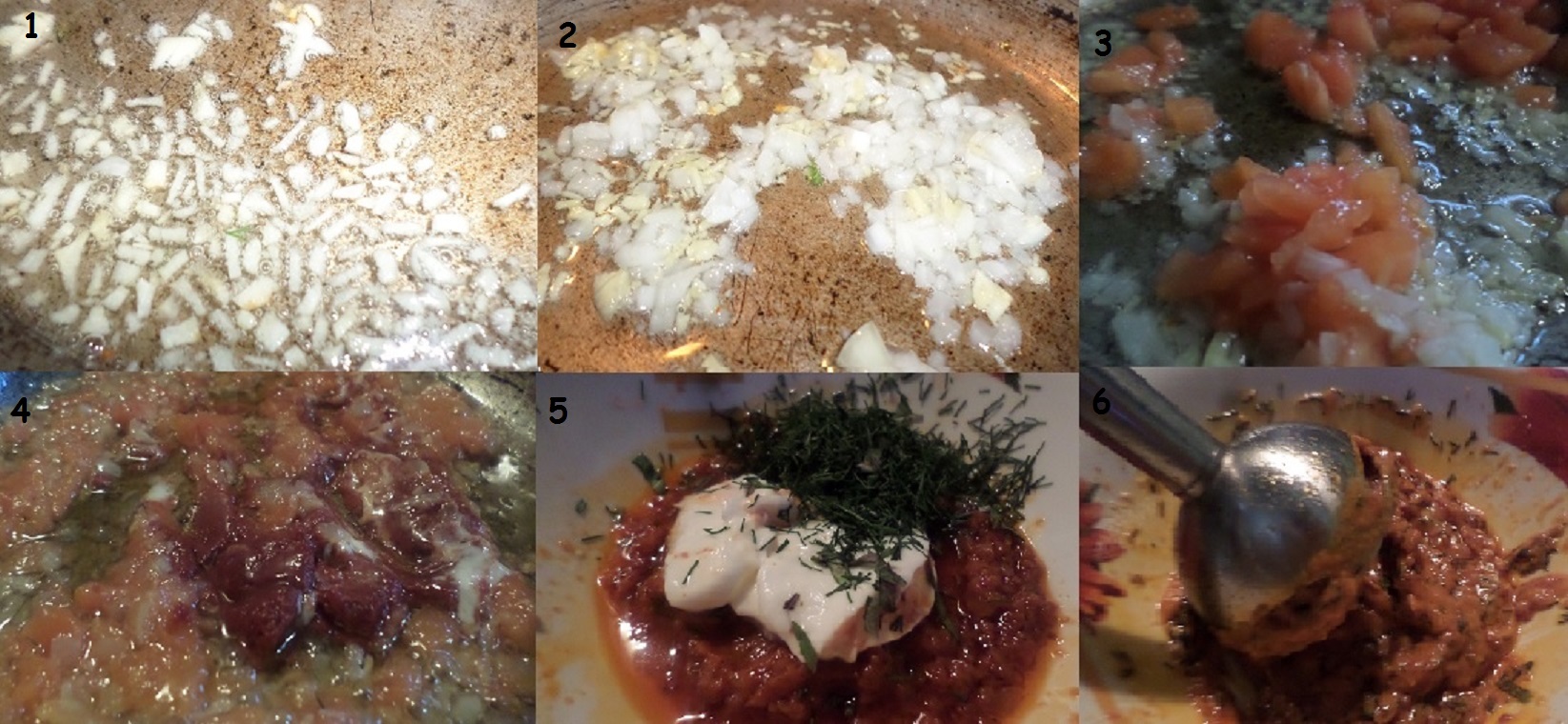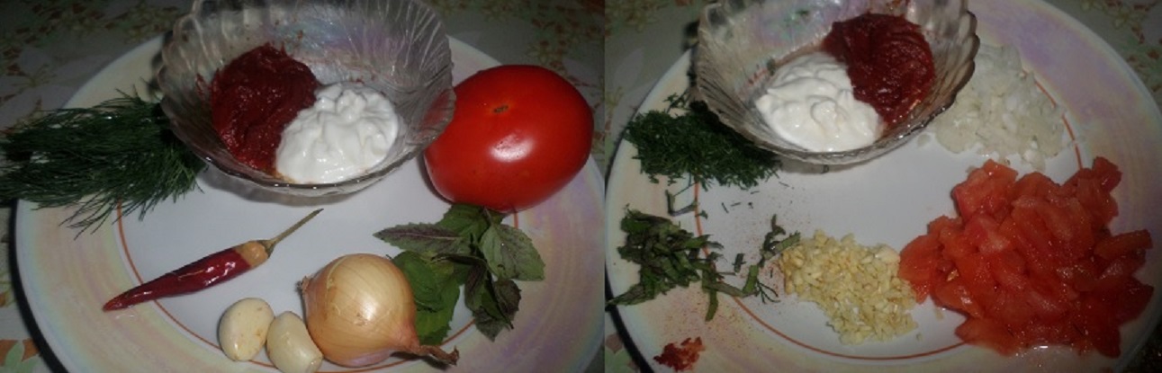 1. Обжариваем лук 2. добавила чеснок 3. и помидорку туда 4. столовую ложку пасты + перчик острый 5. переложила в миску, добавила сметану и зелень. 6. измельчила все блендером.
