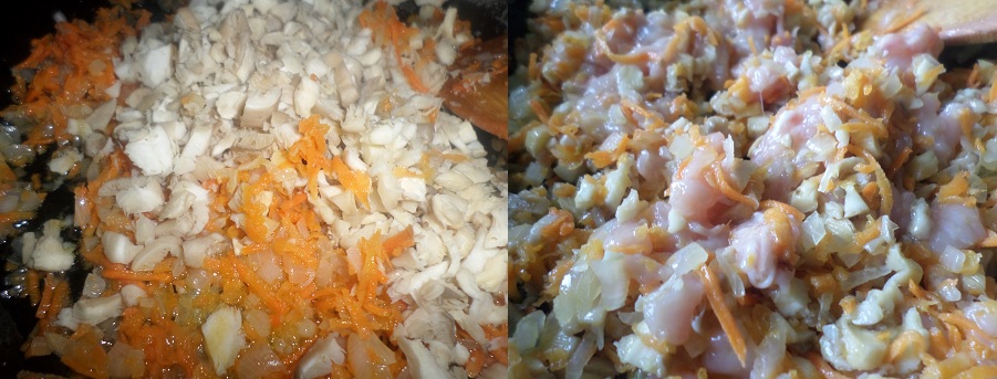 Лук и морковь обжариваю на растительном масле. Добавила туда грибы. На крыльях осталось мясо, срезав его отправила к грибам.