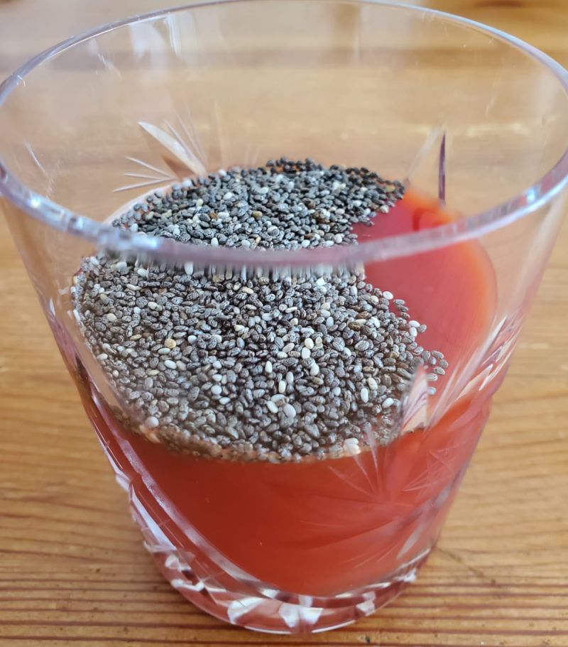Ребята, поскольку в этой теме, мы упомянули чию, то дополню немного о ней. Из чии делают очень вкусные кисели,желе и так далее. Используют сладкие и с кислинкой соки, кокосовое молоко, кисломолочные продукты ( типа ряженка+ немного воды). Многие считают, что чия это для десертного варианта. Можно делать и солёно-острые варианты. На фото томатный сок с чией. Когда семена разбухнут,добавить соль,перец и каплю растительного масла. Сытно,просто и быстро. Этот вариант хорош когда вообще на кухню заходить не хочется. Ну ведь как то надо настроение поднимать? biggrin.gif Нас убивает монотонность, скука и усталость. А так, разнообразили меню новыми рецептами и оживились!