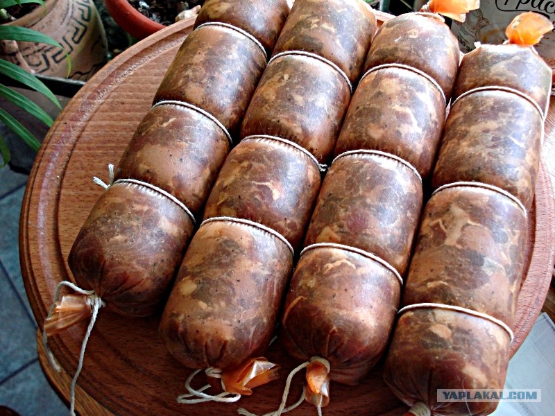 Опять таки, возвращаясь к инструментарию - лишнее пространство в городской кухне на вес золота. Был бы сарай деревенский - вообще без вопросов: есть где хранить, есть где высушивать колбасу. Да и температура в сарае явно не как в городской квартире.