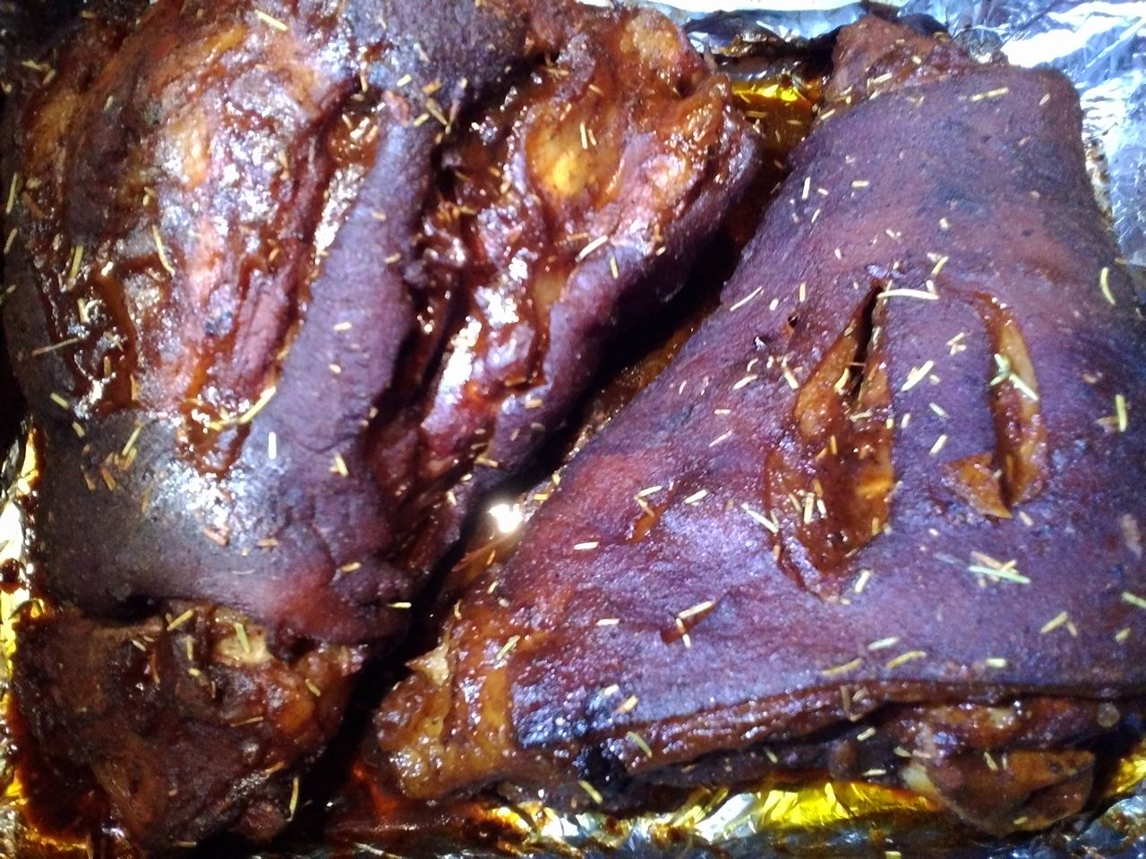 Я сделала это =) Розмарин не нашла, поэтому майоран и свежевыжатый сок грейпфрута в обмазку и цедра в маринад при варке. И + гвоздика =)