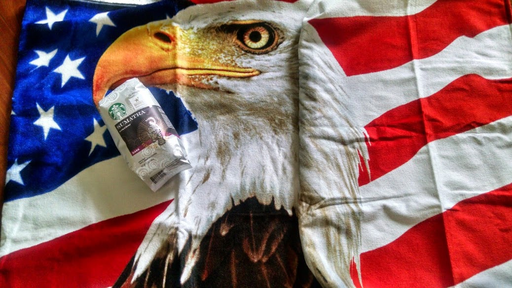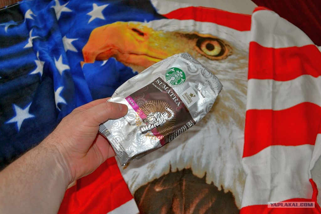 Дорогой Володя. Я не отмолчалась, а мужественно ждала, подходящего момента, выдерживая паузу с трудом, как настоящая женщина biggrin.gif Твое суфле наверняка не то самое сомнительное суфле от Вани, а вполне себе приличное всем суфле, суфле. Раньше отважных рыцарей, дамы награждали поцелуями и кой чем еще при случае, но по скольку я не дама и поцелуи у меня ток воздушные, то в награду за проявленное мужество, терпение к моим капризам в виде сложного, не смотря на всю простоту ингридиентов блюдо, отправляю небольшие дары: полотенце с символом USA и кофей Starbucks . Хотелось бы конечно суфле попробовать, а не только посмотреть, все же надеюсь, что когда-нибудь ты до нас доедешь и мы сможем предаться кулинарным удовольствиям под пизирёк красненького rulez.gif И так - символы Американской Мячты, отправляются в Челябу biggrin.gif