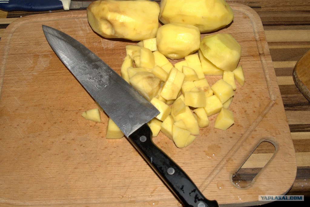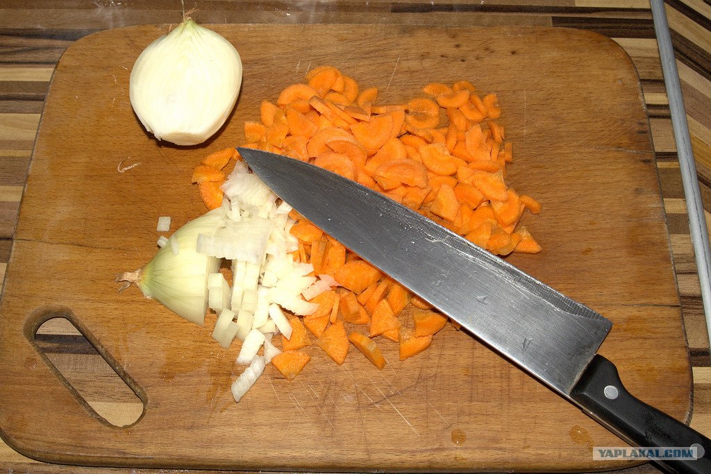 Роняя скупую мужскую слезу, нарезаем лук и морковь.
