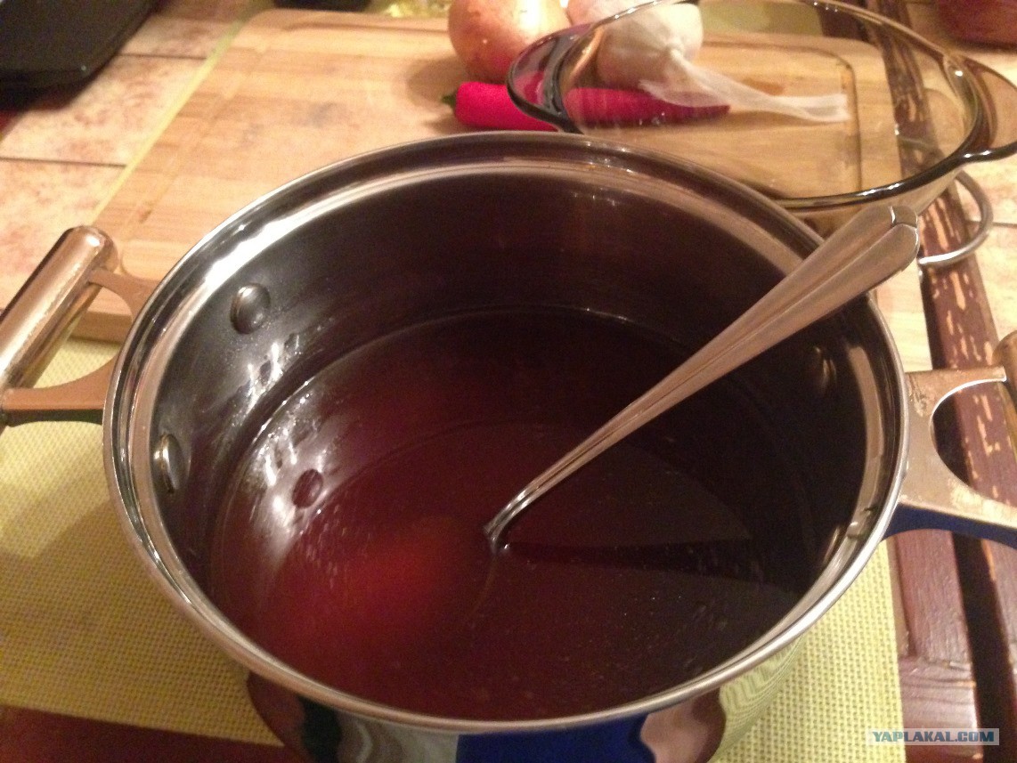 Ближе к готовности картина будет примерно такая. Как видите объем соуса уменьшился примерно вдвое. Не стоит беспокоится, если соус Вам кажется жидким. Во-первых, по мере остывания он будет густеть, во-вторых, он и не должен быть густым как кетчуп.