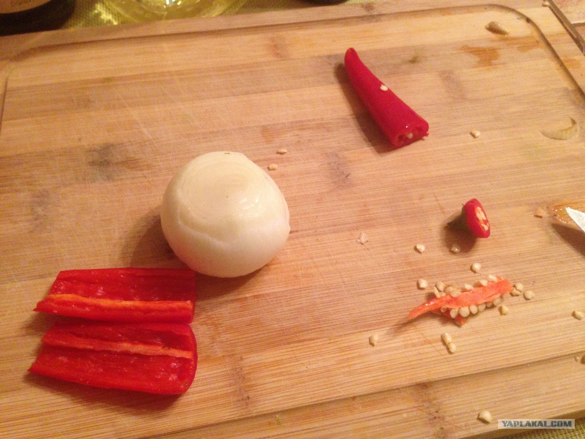 Нарезаем перец чили дольками и освобождаем от семян. Я люблю по-острее, потому использую от ½ до ¾ стручка, однако можно ограничиться и ¼ частью. С лука снимаю пару верхних слоев.
