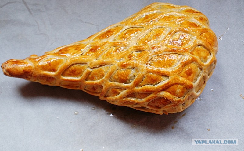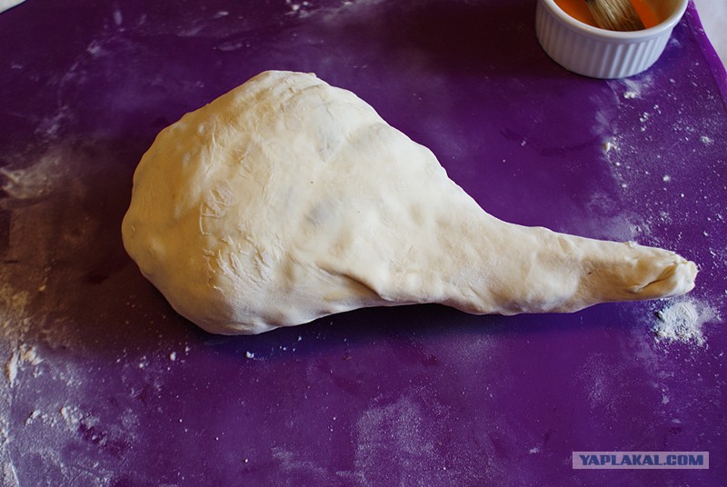 Нижний слой теста промазала желтком, надела «чулок» и снова покрыла всю поверхность яйцом. Оправила в заранее разогретую до 180 град. духовку