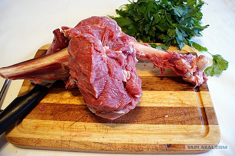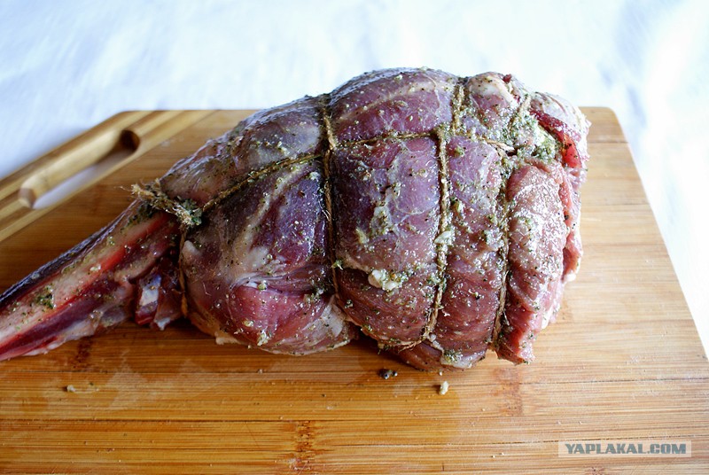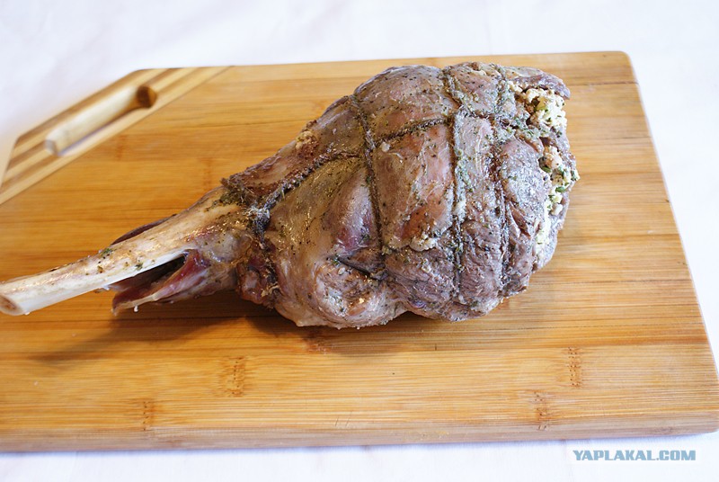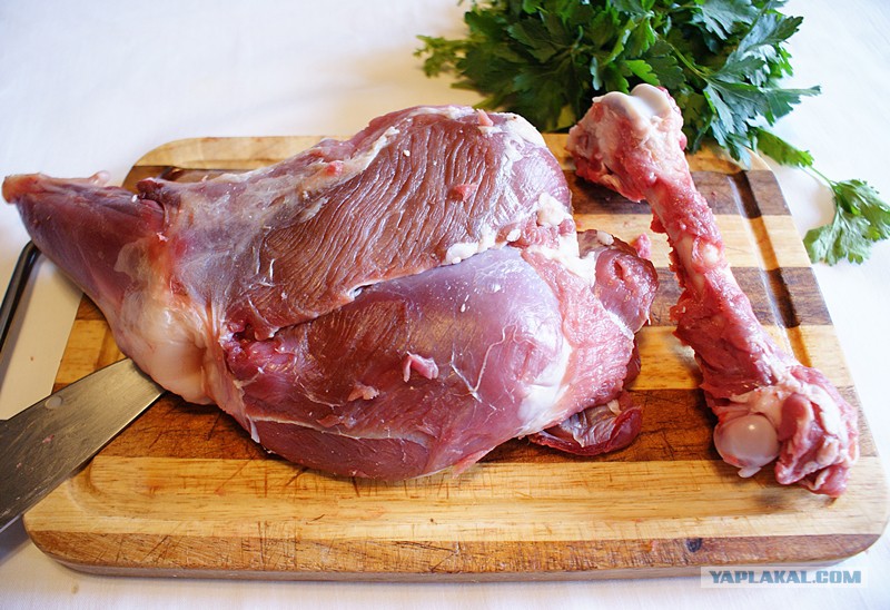 Баранью конечность помыла, обсушила бумажным полотенцем, срезала лишний жир, плёнки и прочие излишества, а то неизвестно, откуда Белка её тащила. Удалила тазовую кость, мякоть надрезала вдоль бедренной кости