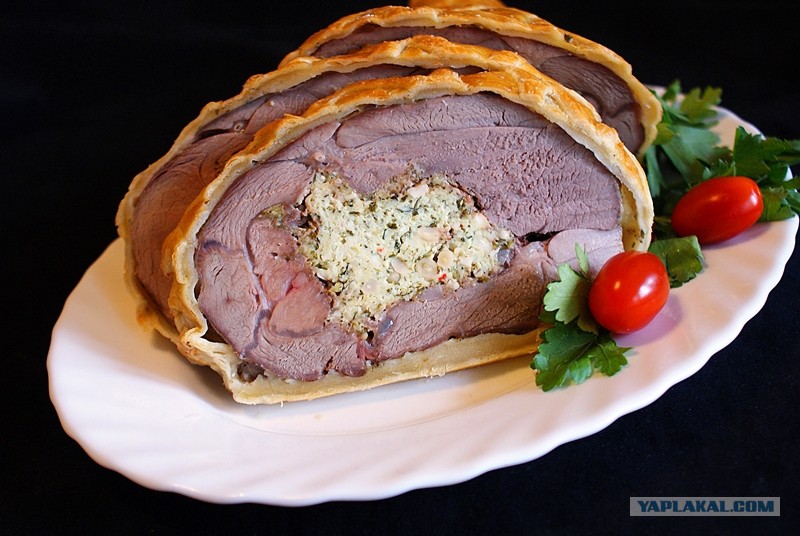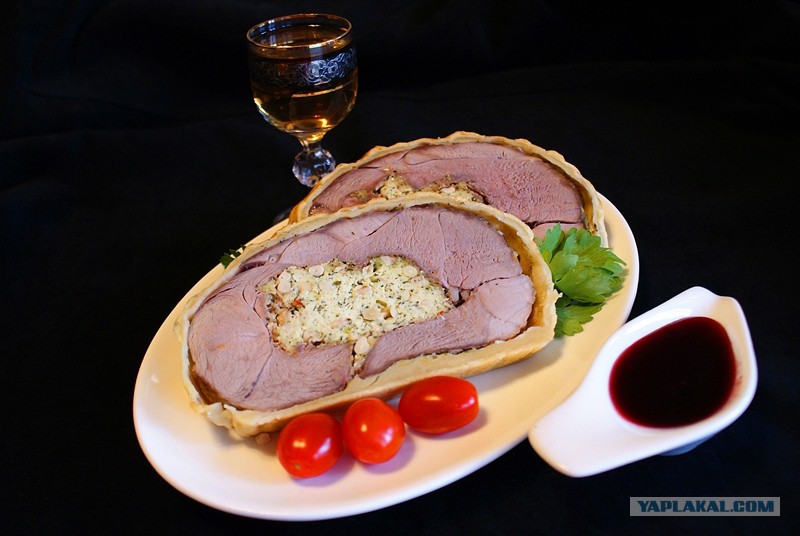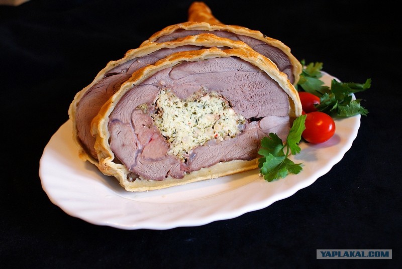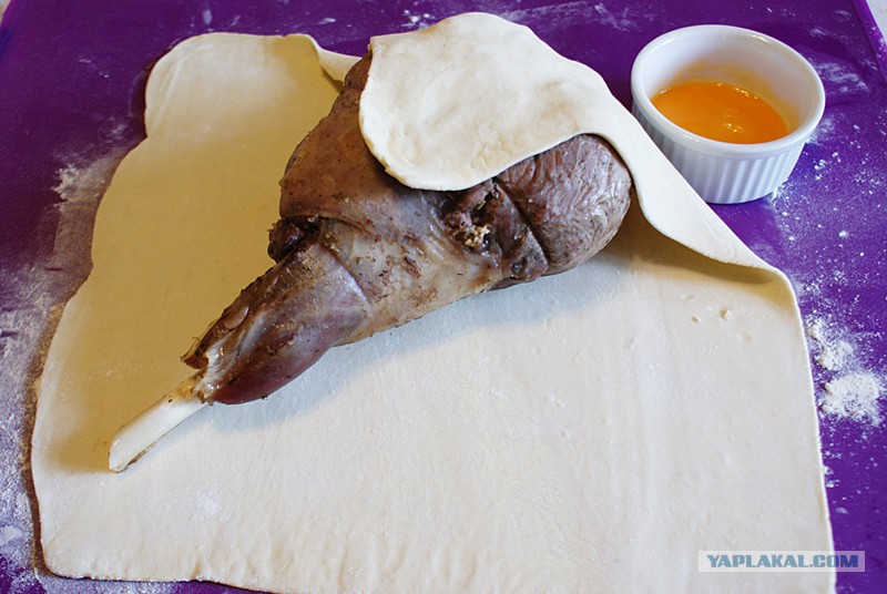 После того, как окорок остыл, я удалила кулинарную нить, раскатала 1 пласт слоёного теста, обернула им мясо, промазывая стыки желтком