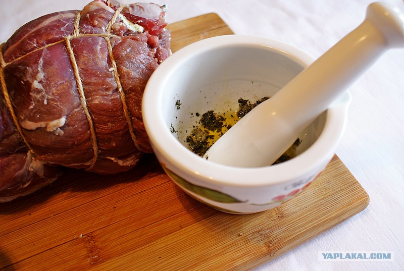 Получившейся смесью тщательно обмазала мясо, обернула фольгой и отправила в заранее разогретую до 200 град. духовку