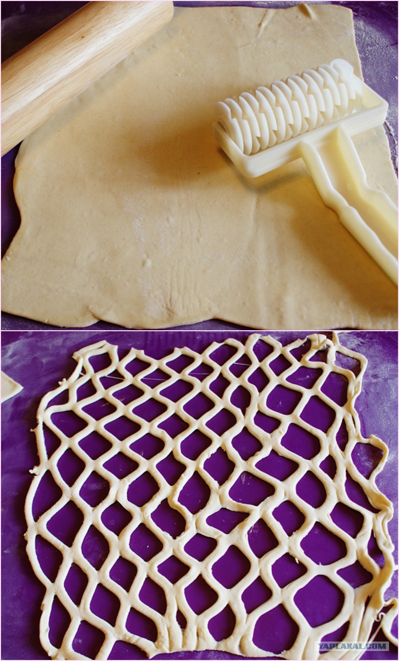 Для этого второй пласт слоёного теста раскатала толщиной около 5 мм и с помощью белого загадочного гаджета (на фото справа), сделала сетку