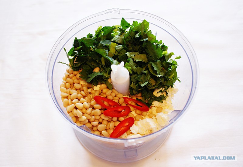 Теперь начинка. Сыр, зелень, чеснок ( 2 зубка), острый перец и орехи измельчила в блендере