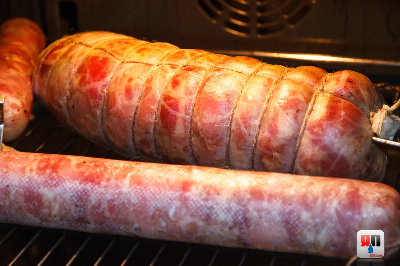 кладем в духовку выставленую на 50°, втыкаем термощуп. запекать будем до 69-71° внутри колбасы. через два часа температуру в духовке поднимаем до 80-90° и запекаем дальше