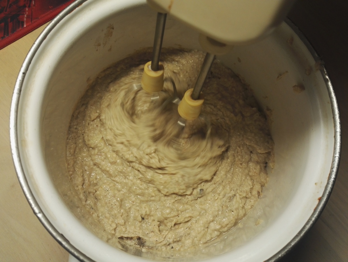 10. Тщательно, на высоких оборотах, гомогенизируем и вспушиваем миксером. У нас еще советский, собранный из танковых запчастей.