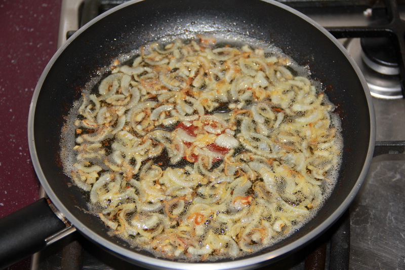 Далее режем луковицу соломкой, растапливаем в сковороде сливочное масло и обжариваем лук в масле до золотистого цвета. Излишки масла не помеха, они потом прекрасно впитаются в рыбу.