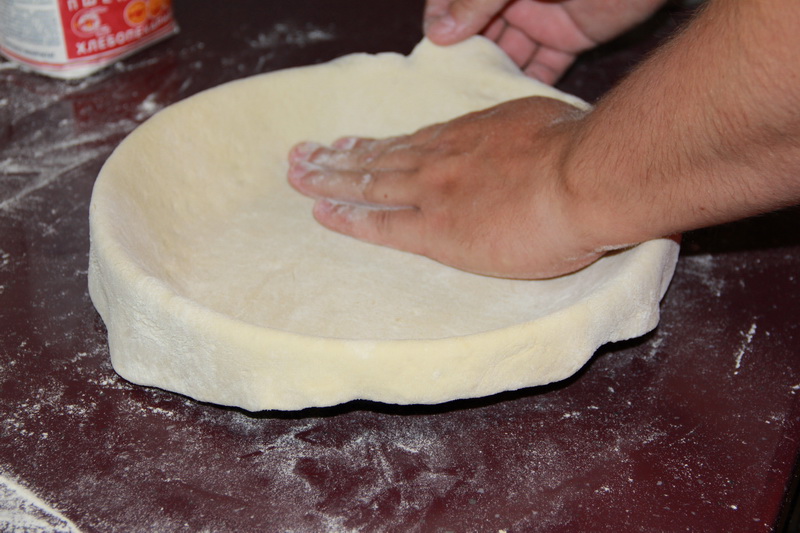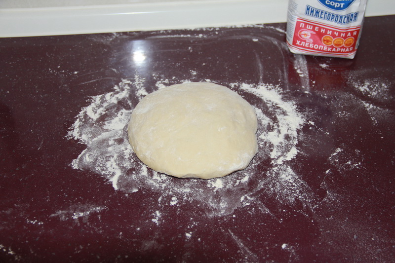 Когда тесту уже станет тесно в кастрюле, высыпаем на стол горку муки, вываливаем на неё тесто и вымешиваем подсыпая муку до тех пор пока тесто не перестанет прилипать к рукам. Как вымесили, накрываем тесто салфеткой и оставляем немного отдохнуть.